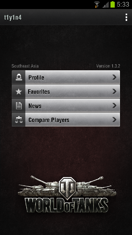 首先要介绍的是“坦克世界助手”(World of Tanks Assistant)1.3.2 此款应用是由WG官方开发,可以让玩家随时查看自己的战绩,包括战斗数、胜率、已造成伤害、占旗等等多种资料。 而且也能够让玩家查看其它玩家的战绩,这样遇到奇葩队友时……查看一下他的战绩就会比较释怀了…… 不过缺点就是目前只有英文和俄文版本,按照目前在台湾开设办公室的情况来看,或许之后会提供中文介面也说不定啊~ PS:使用时需要网络 PS2:此款应用同时有android和ios两种版本 首先是登陆页面 记得选择正确的伺服器啊,目前有 俄服、欧服。美服和海服 这就是登陆后的主介面了 由上至下分别为: 战绩资料(Profile) 喜好列表(Favorites) 最新消息(News,根据你所在伺服器会有稍微不同) 玩家对比(Compare Players) 点击主页面右上角叁颗点会出现叁个选项,设定(Settings)、说明(About)和登出(Logout) 在设定页面里可以设定是否在有新消息更新时通知你,以及多久检测是否有新消息, 下方还可以设定小工具的显示週期 |