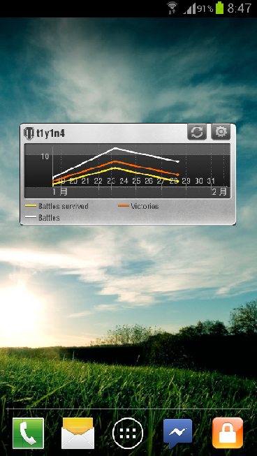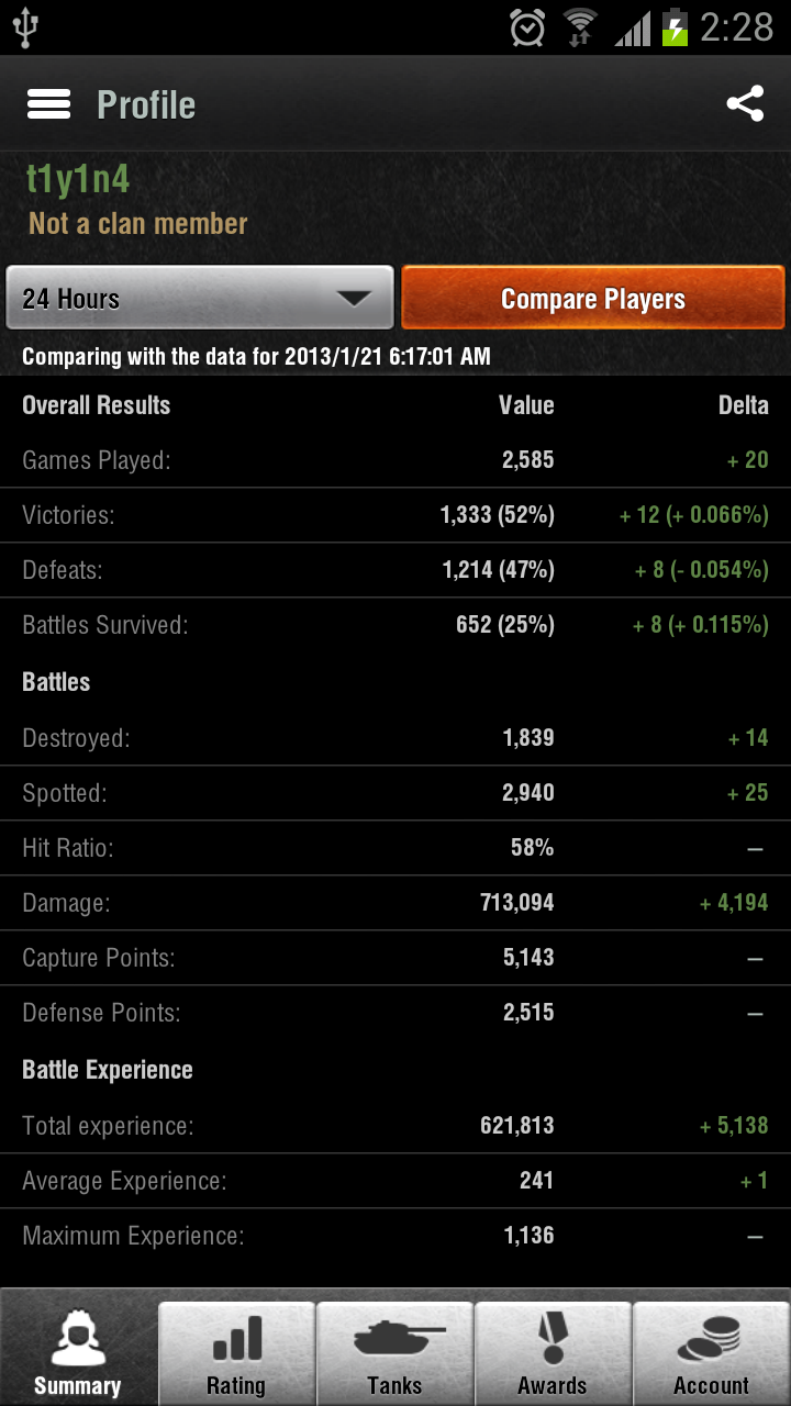 这是桌面小工具示意图 在“战绩资料”(Profile)的“概要”(Summary)里能够显示各种数据比如最基本的战斗数、胜利数、生存数、击毁战车数、发现数、击中率、已造成累计伤害等等…… 而且在“24 Hours”那选项设定过去多久时间内的增加量 (渣战绩勿喷) 右上角会有个分享按钮让玩家把自己的战绩截图了分享至不同网络社区 |