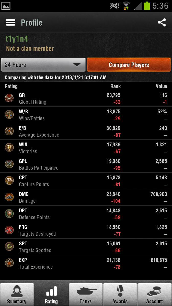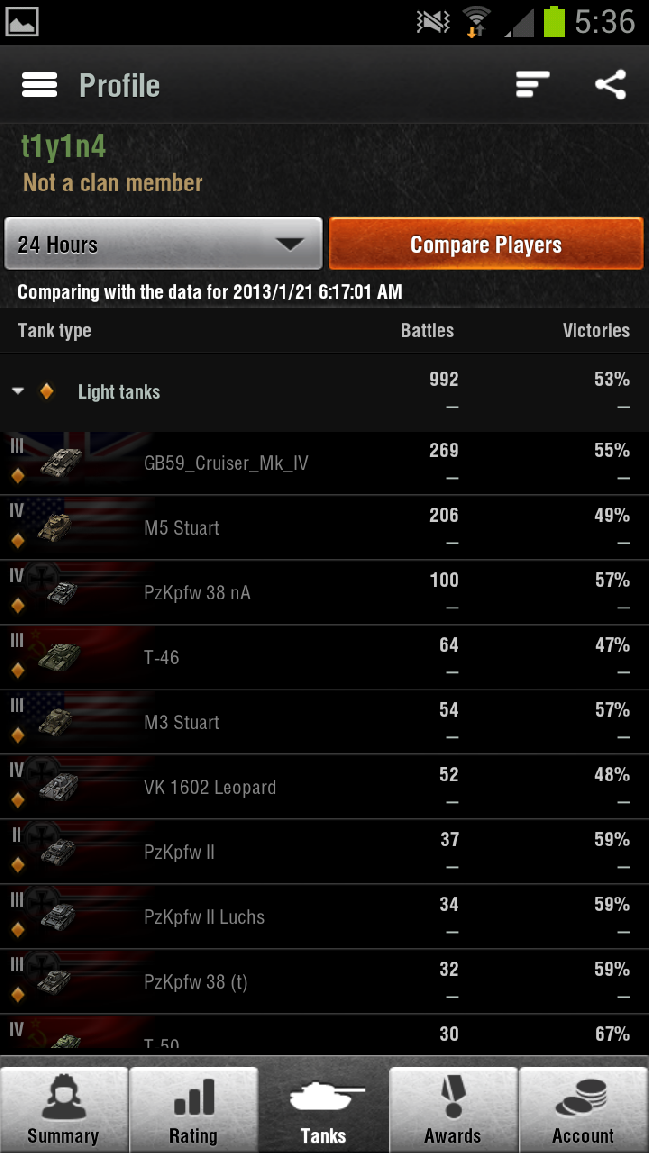 在“排名”(Rating)能够查看自己在该伺服器的排名 在“战车”(Tanks)页面则可以查看自己各战车使用次数、胜率等等 |
