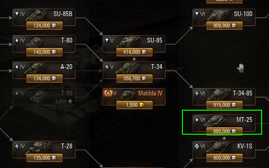 未来0.8.2版本中将加入的新坦克有两辆,一辆是D系7级特种战车E-25,另一辆是S系6级轻坦MT-25。从科技树中显示,MT-25将取代原6级轻坦T-50-2。